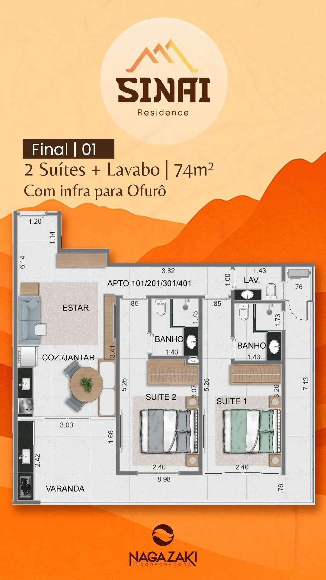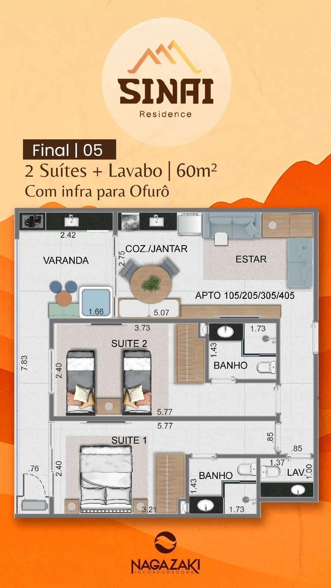 Aptos tipo: de 60 a 76 m² (2 suítes + lavabo)